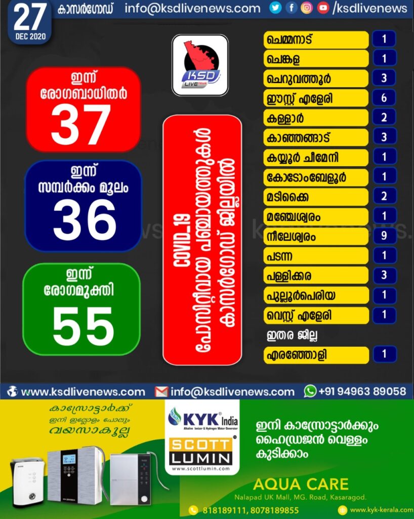 കാസർഗോഡ് ജില്ലയിൽ ഇന്ന് കോവിഡ് സ്ഥിരീകരിച്ചവരുടെ പഞ്ചായത്ത് തിരിച്ചുള്ള സ്ഥിതി വിവര കണക്ക്