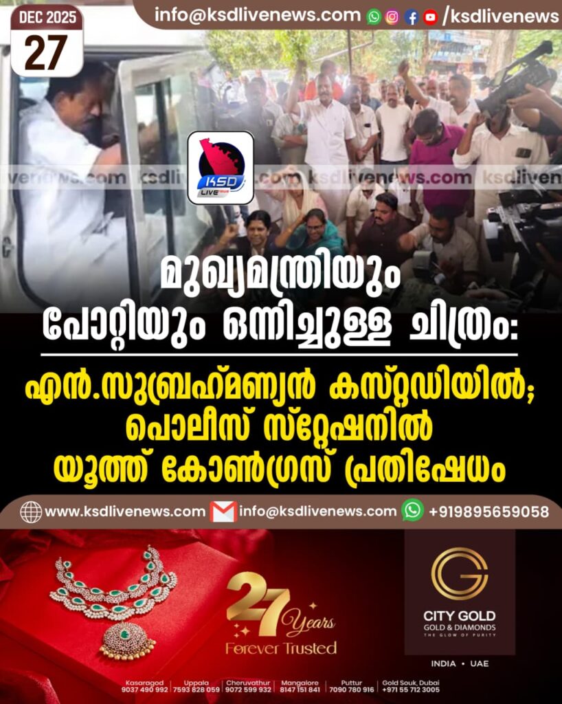 മുഖ്യമന്ത്രിയും പോറ്റിയും ഒന്നിച്ചുള്ള ചിത്രം: എൻ.സുബ്രഹ്മണ്യൻ കസ്റ്റഡിയിൽ; പൊലീസ് സ്റ്റേഷനിൽ യൂത്ത് കോൺഗ്രസ് പ്രതിഷേധം