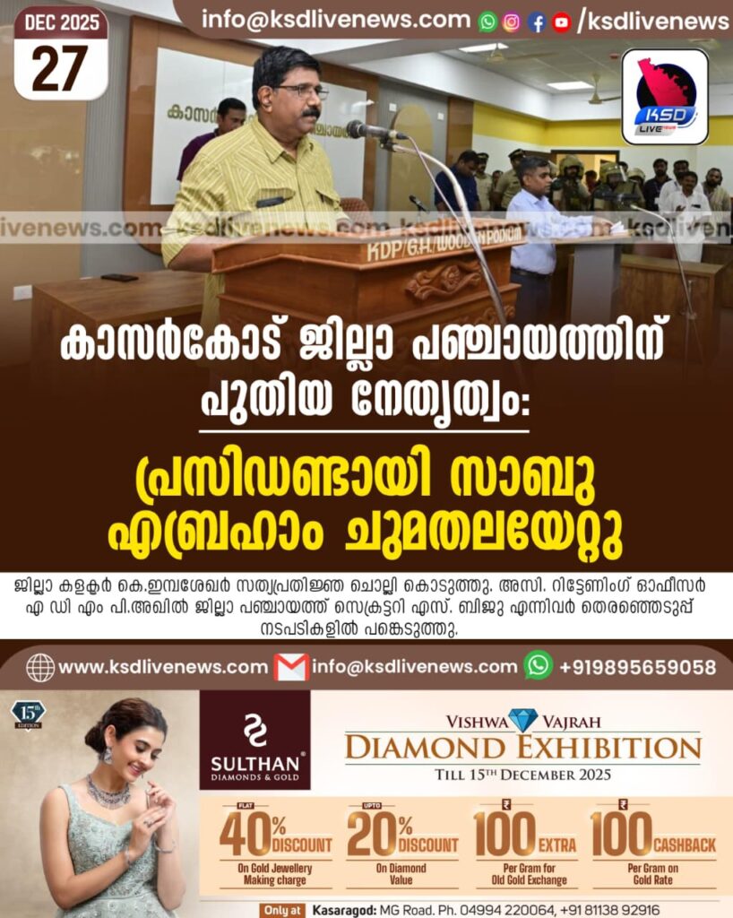 കാസർകോട് ജില്ലാ പഞ്ചായത്തിന് പുതിയ നേതൃത്വം; പ്രസിഡണ്ടായി സാബു എബ്രഹാം ചുമതലയേറ്റു