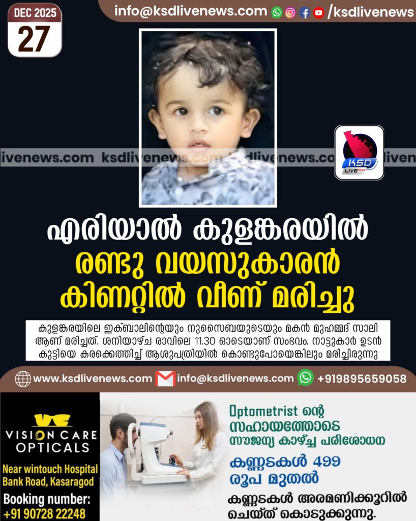 എരിയാൽ കുളങ്കരയിൽ രണ്ടുവയസുകാരൻ കിണറ്റിൽ വീണ് മരിച്ചു