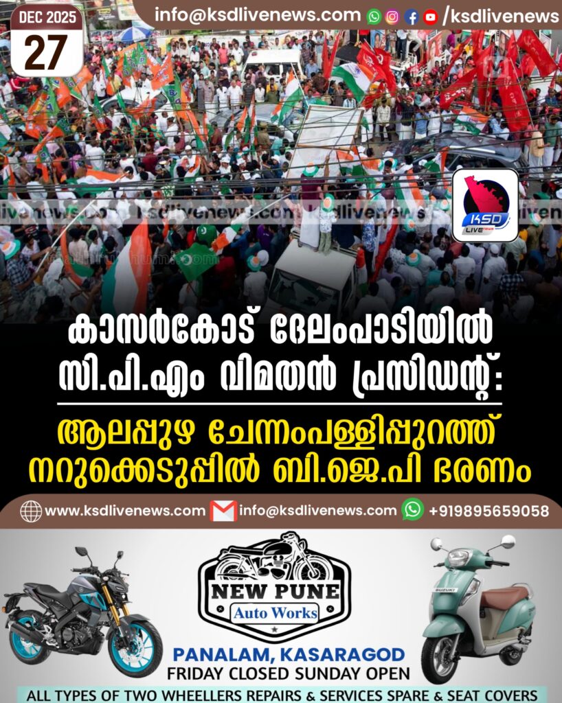 കാസർകോട് ദേലംപാടിയിൽ സി.പി.എം വിമതൻ പ്രസിഡന്റ്: ആലപ്പുഴ ചേന്നംപള്ളിപ്പുറത്ത് നറുക്കെടുപ്പിൽ ബി.ജെ.പി ഭരണം