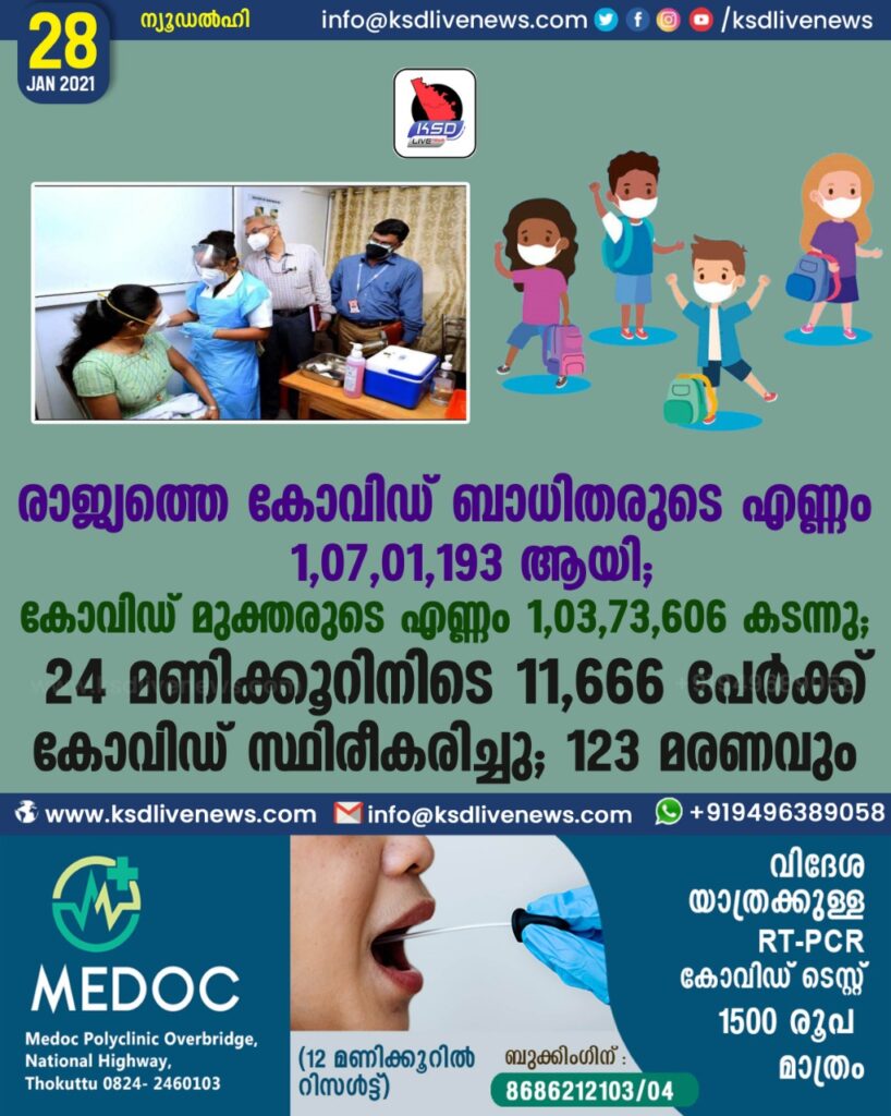 24 മണിക്കൂറിനിടെ 11,666 പേർക്ക് കോവിഡ് സ്ഥിരീകരിച്ചു ; 123 മരണവും