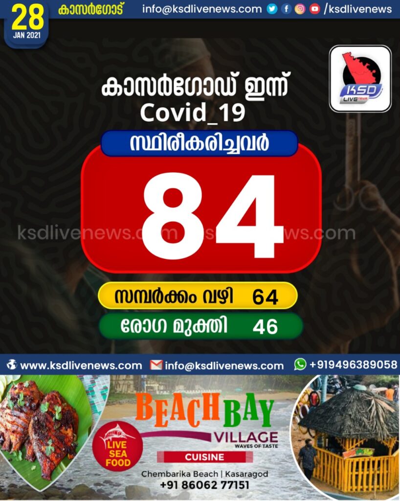 കാസർഗോഡ് ജില്ലയിൽ ഇന്ന് 84 പേർക്ക് കോവിഡ് സ്ഥിരീകരിച്ചു.