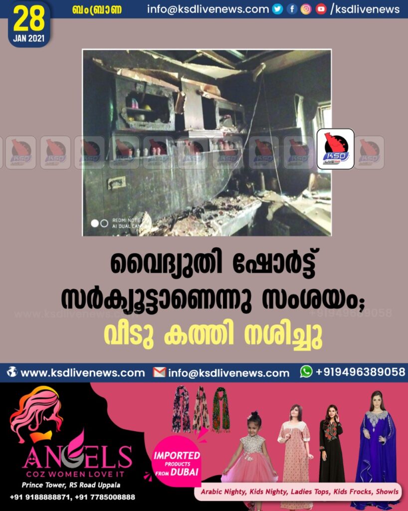 ബംബ്രാണ : വൈദ്യുതി ഷോർട്ട് സർക്യൂട്ടിനെത്തുടർന്നു വീടു കത്തി നശിച്ചു.ബംബ്രാണ ഹെൽത്ത് സെന്ററിനടുത്ത റഷീദിന്റെ വീടാണ് ഇന്നു പുലർച്ചെ കത്തി നശിച്ചത് . റഷീദ് ഗൾഫിലാണ് . ഭാര്യ സുബൈദയും രണ്ടു മക്കളുമാണ് വീട്ടിൽ താമസിക്കുന്നത് . ഇവർ ഇന്നലെ മഞ്ചേശ്വരത്തുള്ള സുബൈദയുടെ മാതാവിന്റെ വീട്ടിലേക്കു പോയിരുന്നു . ഇന്നു രാവിലെ വീട്ടിൽ നിന്നു പുക ഉയരുന്നതു കണ്ട അയൽവാസികൾ ജനൽ ഗ്ലാസ് തകർത്തു നോക്കിയപ്പോളാണ് തീപിടിത്തം അറിവായത് . വിവരമറിഞ്ഞെത്തിയ ഫയർഫോഴ്സ് തീകെടുത്തി . സുബൈദ തിരിച്ചെത്തിയാലേ നാശനഷ്ടം കണക്കാക്കാനാവൂ എന്ന് ഫയർഫോഴ്സ് അറിയിച്ചു .