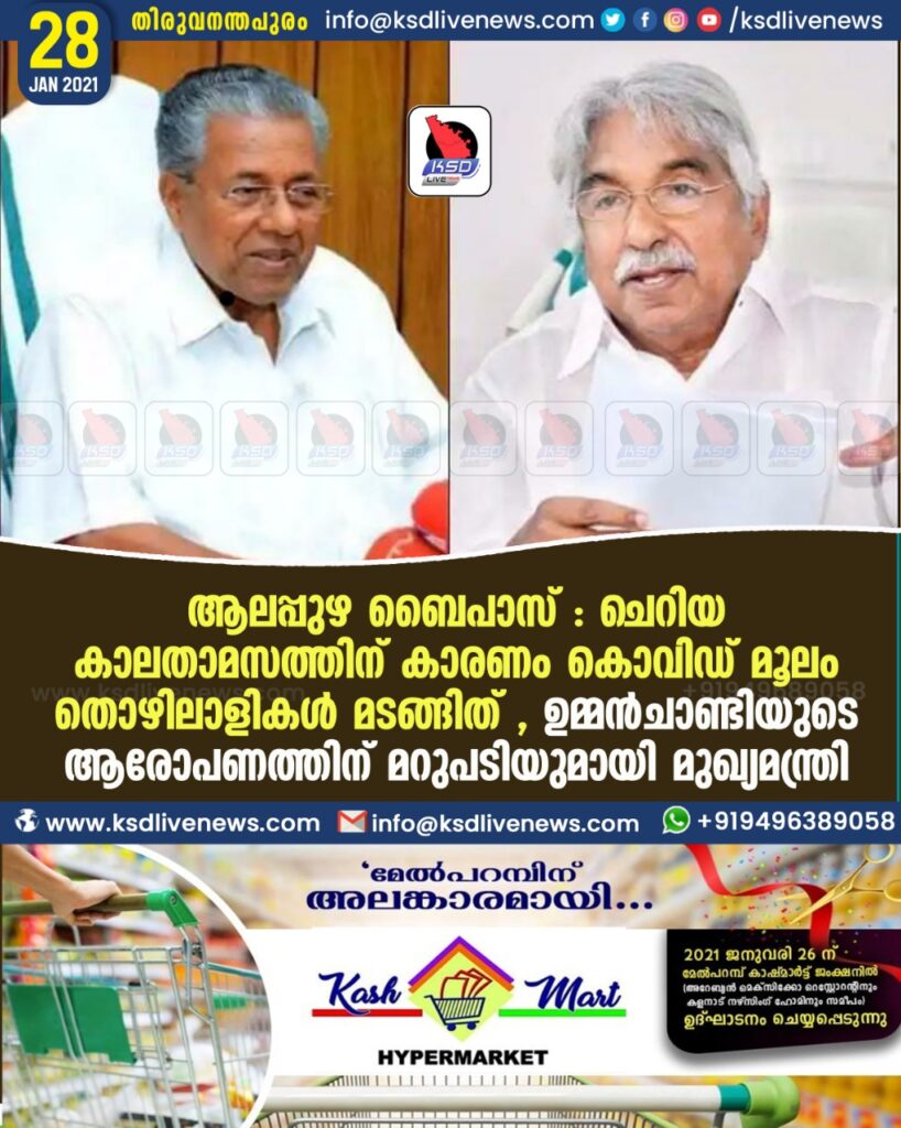 ആലപ്പുഴ ബൈപാസ് : ചെറിയ കാലതാമസത്തിന് കാരണം കൊവിഡ് മൂലം തൊഴിലാളികൾ മടങ്ങിത് , ഉമ്മൻചാണ്ടിയുടെ ആരോപണത്തിന് മറുപടിയുമായി മുഖ്യമന്ത്രി