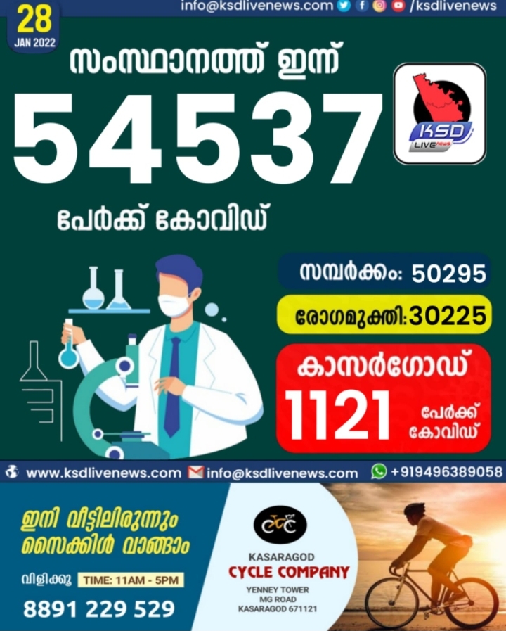 സംസ്ഥാനത്ത് ഇന്ന് 54537 കോവിഡ് സ്ഥിരീകരിച്ചു. സമ്പർക്കം വഴി 50295 പേർക്കും ; ആശ്വാസമായി 30225 പേർക്ക് രോഗമുക്തി ; കാസർഗോഡ് ജില്ലയിൽ 1121 പേർക്ക് പുതിയ കോവിഡ് കേസുകൾ ; മരണം 13