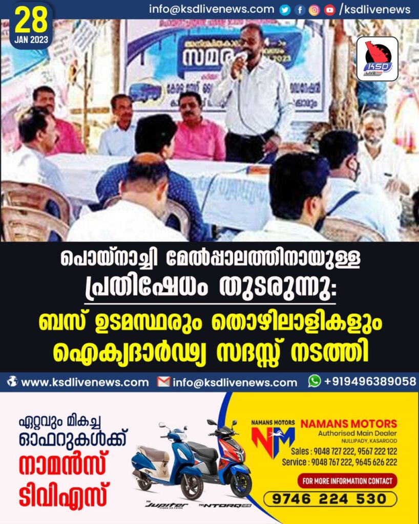 പൊയിനാച്ചി : ദേശീയപാത വികസനത്തിന്റെ ഭാഗമായി പൊയിനാച്ചിയിൽ മേൽപ്പാലം വേണമെന്നാവശ്യപ്പെട്ട് 34 ദിവസമായി നടക്കുന്ന സമരത്തിന് പിന്തുണയുമായി കേരളാ സ്റ്റേറ്റ് പ്രൈവറ്റ് ബസ് ഓപ്പറേറ്റേഴ്സ് ഫെഡറേഷൻ കാസർകോട് താലൂക്ക് കമ്മിറ്റിയും ബന്തടുക്ക റൂട്ടിലെ ബസ് ജീവനക്കാരും. പൊയിനാച്ചിയിലെ സമരപ്പന്തലിൽ ഇവർ ഐക്യദാർഢ്യ സദസ്സ് നടത്തി. ബന്തടുക്ക റോഡിന്റ നിലവിലെ പ്രവേശനകവാടത്തിലൂടെ യാത്രാ സ്വാതന്ത്ര്യം നിഷേധിക്കുന്നത് നീതീകരിക്കാനാവില്ലെന്നും അധികൃതർ തീരുമാനം പുനഃപരിശോധിക്കണമെന്നും കൂട്ടായ്മ അഭിപ്രായപ്പെട്ടു. ബസ് ഓപ്പററ്റേഴ്സ് ഫെഡറേഷൻ ജില്ലാ പ്രസിഡന്റ് കെ. ഗിരീഷ് പരിപാടി ഉദ്ഘാടനംചെയ്തു. തൊഴിലാളി യൂണിയൻ പ്രതിനിധി പ്രശാന്ത് പയറ്റിയാൽ അധ്യക്ഷനായി. ബസ് ഓപ്പറേറ്റേഴ്സ് ഫെഡറേഷൻ താലൂക്ക് സെക്രട്ടറി സി.എ. മുഹമ്മദ് കുഞ്ഞി, ഹരീഷ് ബി. നമ്പ്യാർ, കെ. രാജൻ അക്ഷയ, രാമകൃഷ്ണൻ കാമലം, രാധാകൃഷ്ണൻ അക്ഷയ, ഗോപി പൊയിനാച്ചി, നാരായണൻ മുണ്ട്യക്കാൽ, ബാലകൃഷ്ണൻ നായർ പൊയിനാച്ചി എന്നിവർ സംസാരിച്ചു. റിപ്പബ്ലിക് ദിനത്തിൽ ‘പറമ്പ് ചങ്ങായിമാർ’ കൂട്ടായ്മയുടെ നേതൃത്വത്തിൽ ഐക്യദാർഢ്യ സദസ്സ് നടത്തി