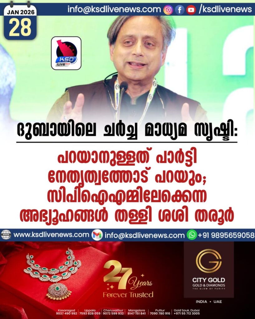ദുബായിലെ ചര്ച്ച മാധ്യമ സൃഷ്ടി: പറയാനുള്ളത് പാര്ട്ടി നേതൃത്വത്തോട് പറയും; സിപിഐഎമ്മിലേക്കെന്ന അഭ്യൂഹങ്ങള് തള്ളി ശശി തരൂര്