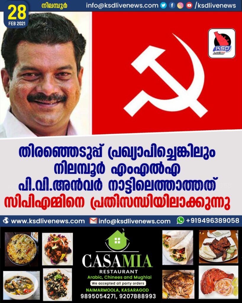 രണ്ടു മാസം മുന്‍പ് വിദേശത്തേക്ക് പോയ അന്‍വര്‍ തിരഞ്ഞെടുപ്പ് പ്രഖ്യാപിച്ചിട്ടും മടങ്ങി മണ്ഡലത്തില്‍ എത്താത്തത് സിപിഎമ്മിനെ വിഷമിപ്പിക്കുകയാണ്. അന്‍വര്‍ അടുത്തയാഴ്ച നാട്ടിലെത്തുമെന്ന വിവരമാണുളളതെന്ന് സിപിഎം നേതൃത്വം വ്യക്തമാക്കുന്നു. സിപിഎം സ്വതന്ത്ര സ്ഥാനാര്‍ഥിയായി ഒരു വട്ടം മാത്രം മത്സരിച്ച അന്‍വറിന് ഇപ്രാവശ്യവും മത്സരിക്കാന്‍ അവസരമുണ്ട്. അന്‍വര്‍ നാട്ടിലെത്തിയ ശേഷം സ്ഥാനാര്‍ഥിയാകുന്നത് അടക്കമുളള കാര്യങ്ങള്‍ ചര്‍ച്ച ചെയ്ത ശേഷം തീരുമാനിക്കും.