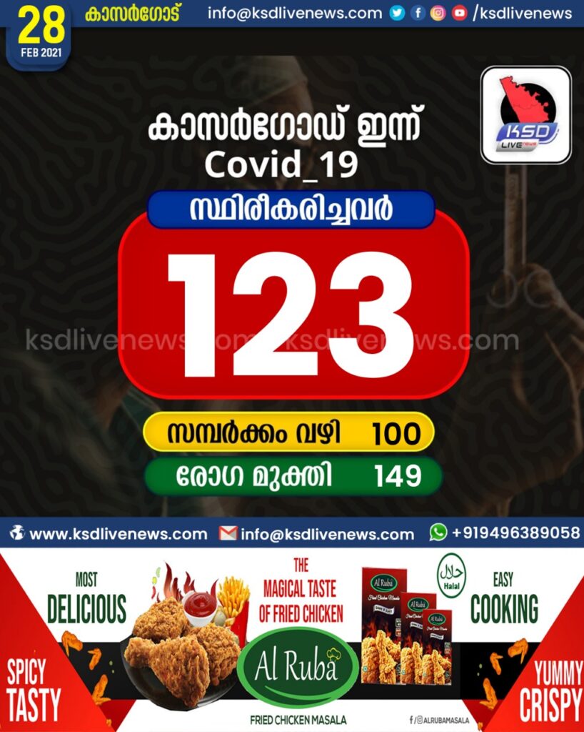 കാസർഗോഡ് ജില്ലയിൽ ഇന്ന് 123 പേർക്ക് കോവിഡ് സ്ഥിരീകരിച്ചു. സമ്പർക്കം വഴി 100 പേർക്കും. 149 പേർക്ക് രോഗമുക്തി