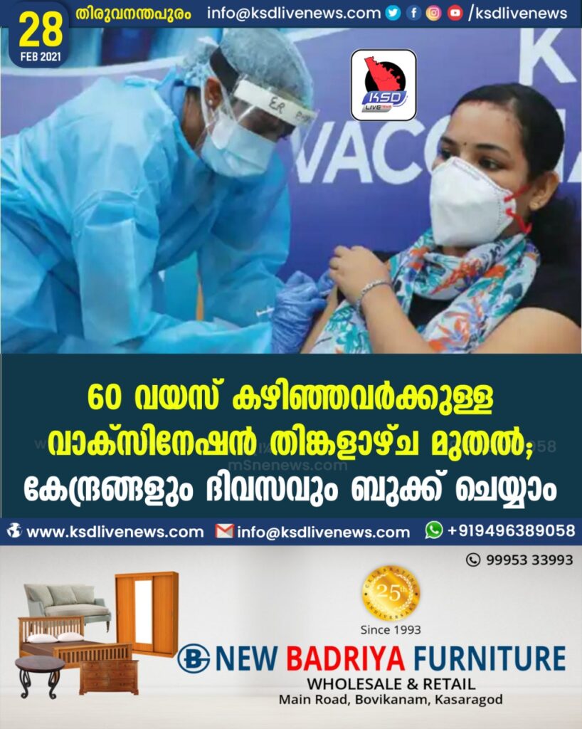 60 വയസ് കഴിഞ്ഞവര്ക്കുള്ള വാക്സിനേഷന് തിങ്കളാഴ്ച മുതല്; കേന്ദ്രങ്ങളും ദിവസവും ബുക്ക് ചെയ്യാം