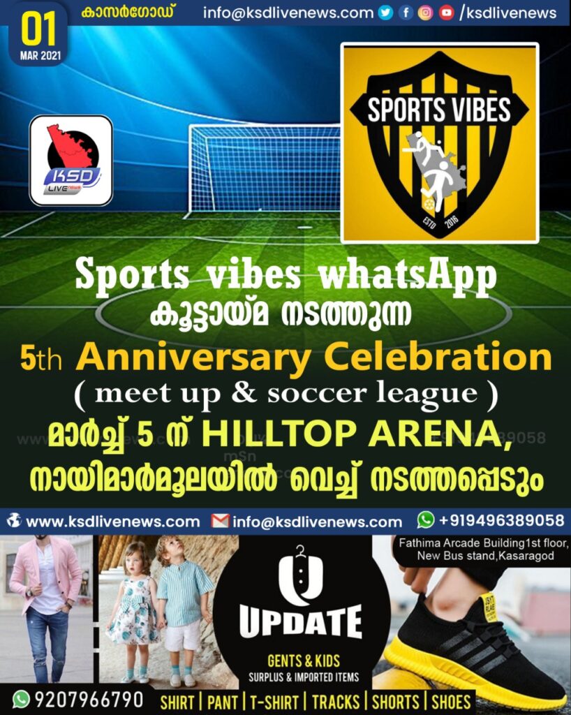 സ്പോർട്സ് വൈബ്സ് വാട്സപ്പ് കൂട്ടായ്മ സംഘടിപ്പിക്കുന്ന സോക്കർ ലീഗ് മാർച്ച് 5 ന് നായിമാർമൂല ഹിൽടോപ് അരീനയിൽSHARE THIS ONSport vibes WhatsAppകൂട്ടായ്മ നടത്തുന്ന 5th Anniversary Celebration ( meet up & soccer league )മാർച്ച് 5 HILLTOP ARENA നായിമാർമൂലയിൽ വെച്ച് നടത്തപ്പെടും