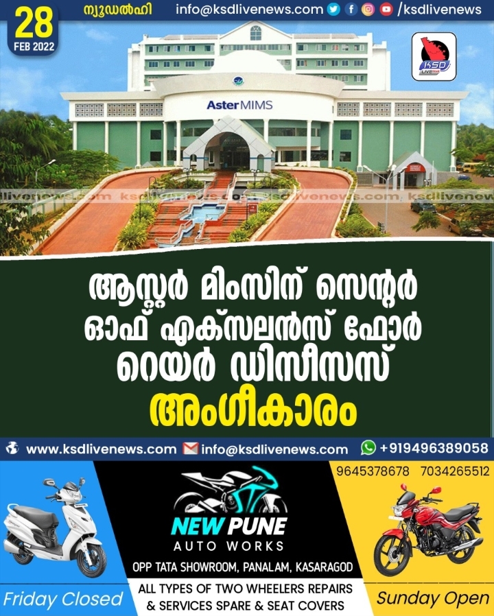 ആസ്റ്റര്‍ മിംസിന് ‘സെന്റര്‍ ഓഫ് എക്‌സലന്‍സ് ഫോര്‍ റെയര്‍ ഡിസീസസ്’ അംഗീകാരം