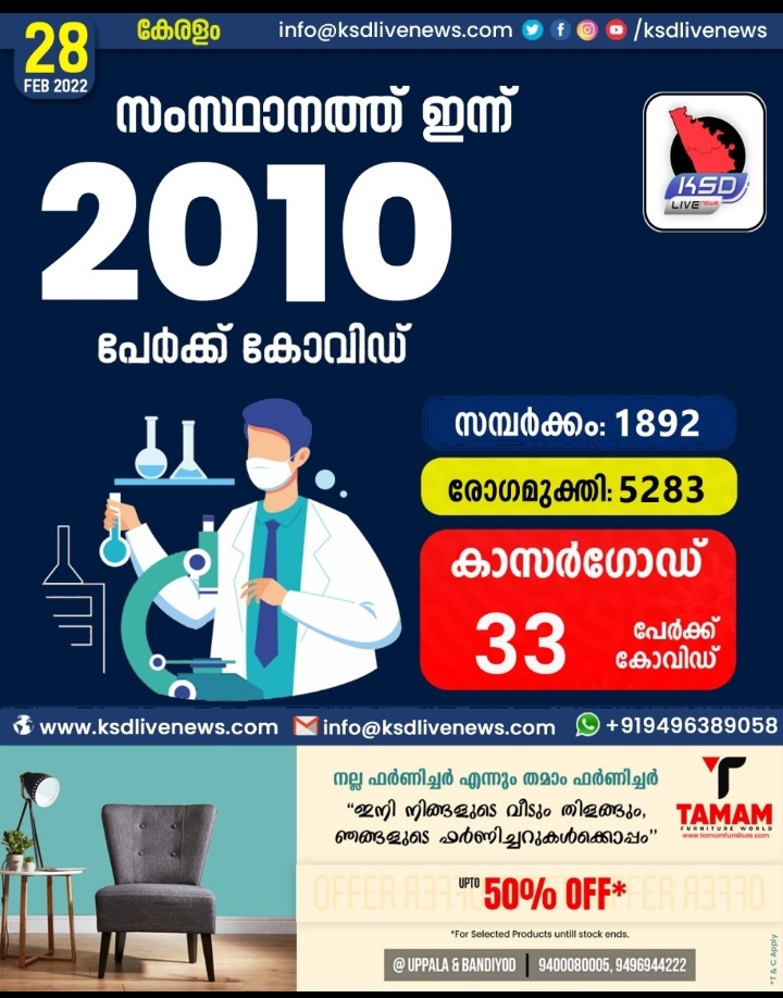 സംസ്ഥാനത്ത് ഇന്ന് 2010 കോവിഡ് സ്ഥിരീകരിച്ചു. സമ്പർക്കം വഴി 1892 പേർക്കും ; ആശ്വാസമായി 5283പേർക്ക് രോഗമുക്തി ; കാസർഗോഡ് ജില്ലയിൽ 33 പേർക്ക് പുതിയ കോവിഡ് കേസുകൾ ; മരണം 07