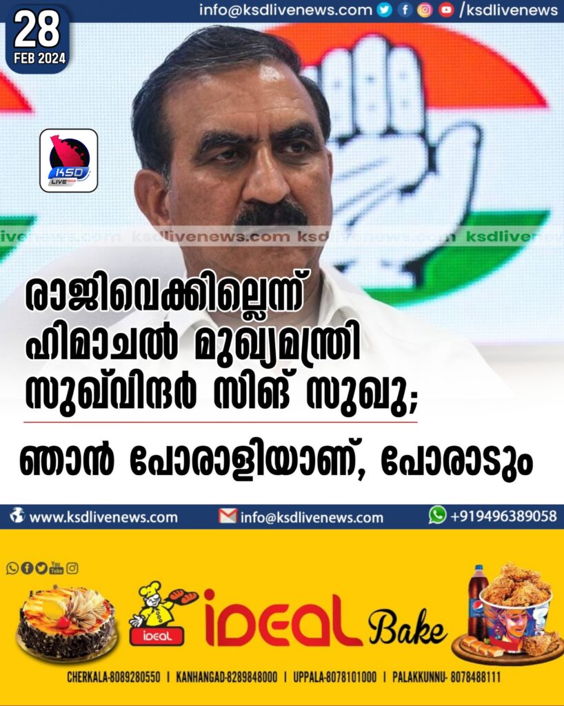രാജിവെക്കില്ലെന്ന് ഹിമാചല് മുഖ്യമന്ത്രി സുഖ്വിന്ദർ സിങ് സുഖു; ‘ഞാന് പോരാളിയാണ്, പോരാടും’