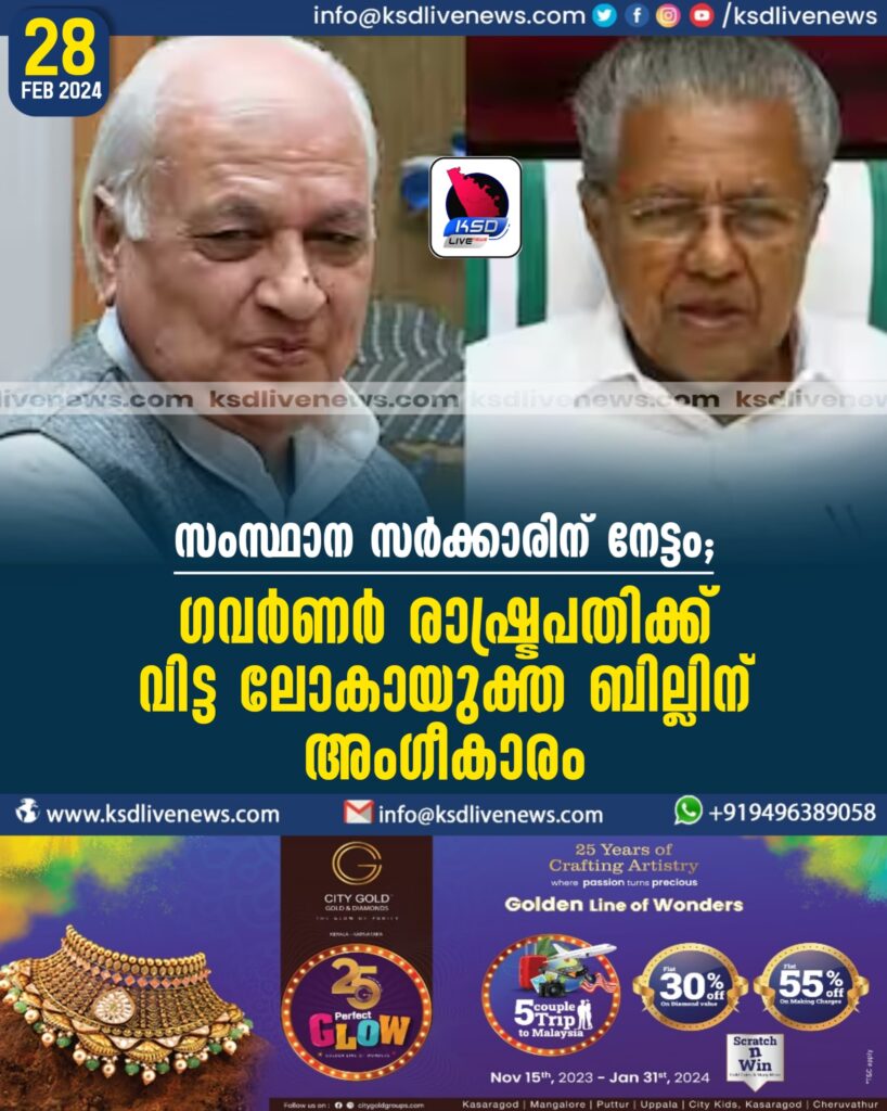 സംസ്ഥാന സര്‍ക്കാരിന് നേട്ടം; ഗവര്‍ണര്‍ രാഷ്ട്രപതിക്ക് വിട്ട ലോകായുക്ത ബില്ലിന് അംഗീകാരം