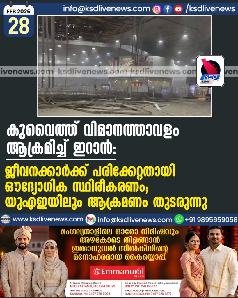 കുവൈത്ത് വിമാനത്താവളം ആക്രമിച്ച് ഇറാൻ: ജീവനക്കാർക്ക് പരിക്കേറ്റതായി ഔദ്യോഗിക സ്ഥിരീകരണം; യുഎഇയിലും ആക്രമണം തുടരുന്നു
