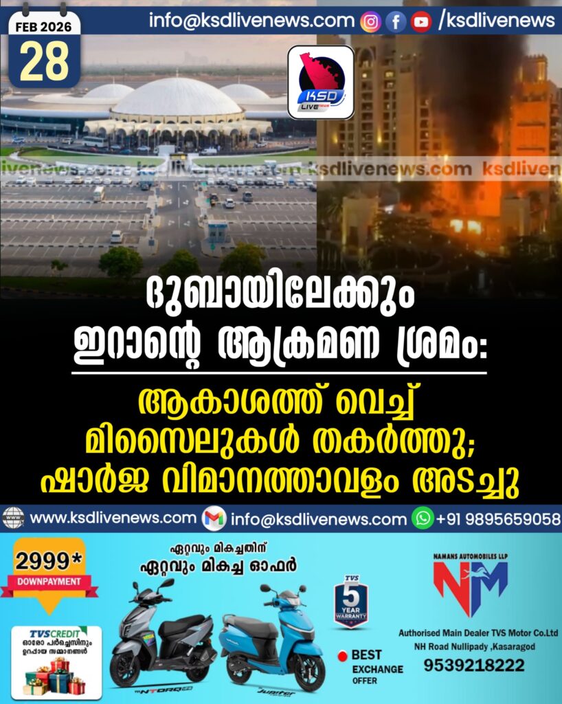 ദുബായിലേക്കും ഇറാന്റെ ആക്രമണ ശ്രമം, ആകാശത്ത് വെച്ച് മിസൈലുകൾ തകർത്തു; ഷാർജ വിമാനത്താവളം അടച്ചു
