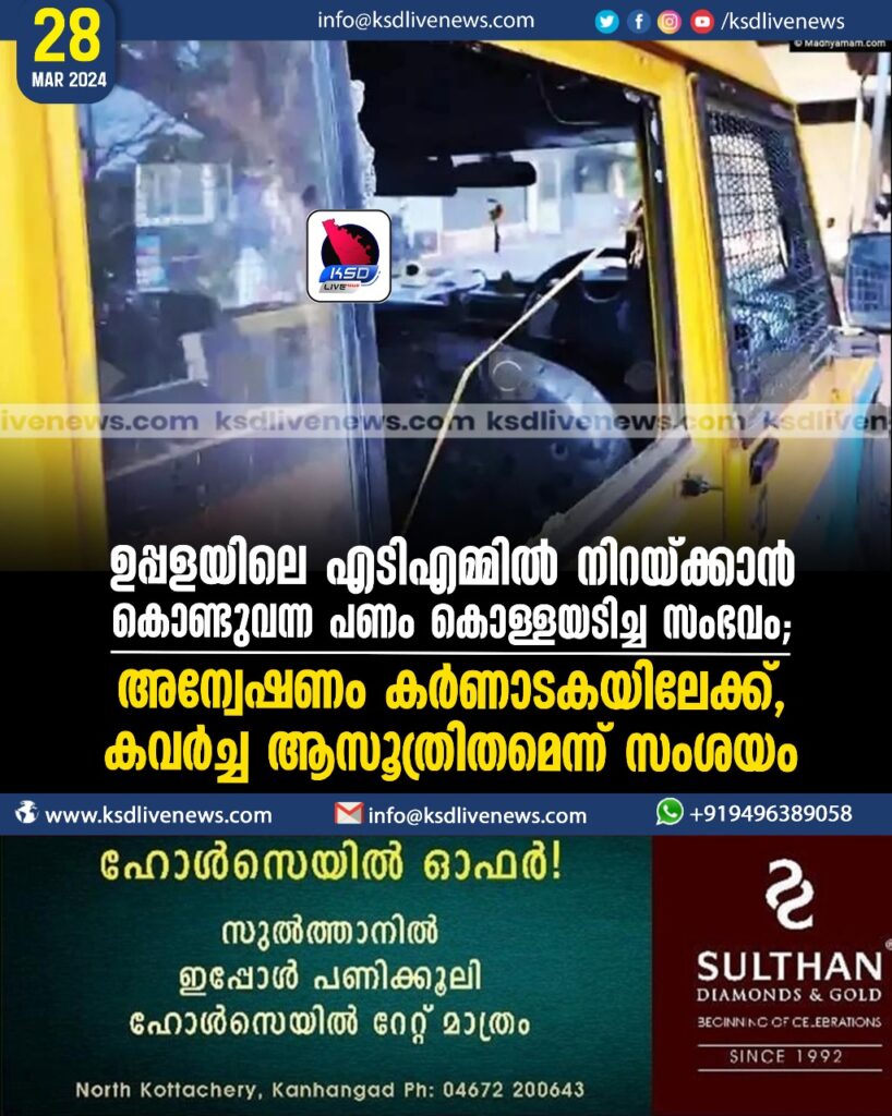 ഉപ്പളയിലെ എടിഎമ്മില് നിറയ്ക്കാന് കൊണ്ടുവന്ന പണം കൊള്ളയടിച്ച സംഭവം ; അന്വേഷണം കര്ണാടകയിലേക്ക്, കവര്ച്ച ആസൂത്രിതമെന്ന് സംശയം
