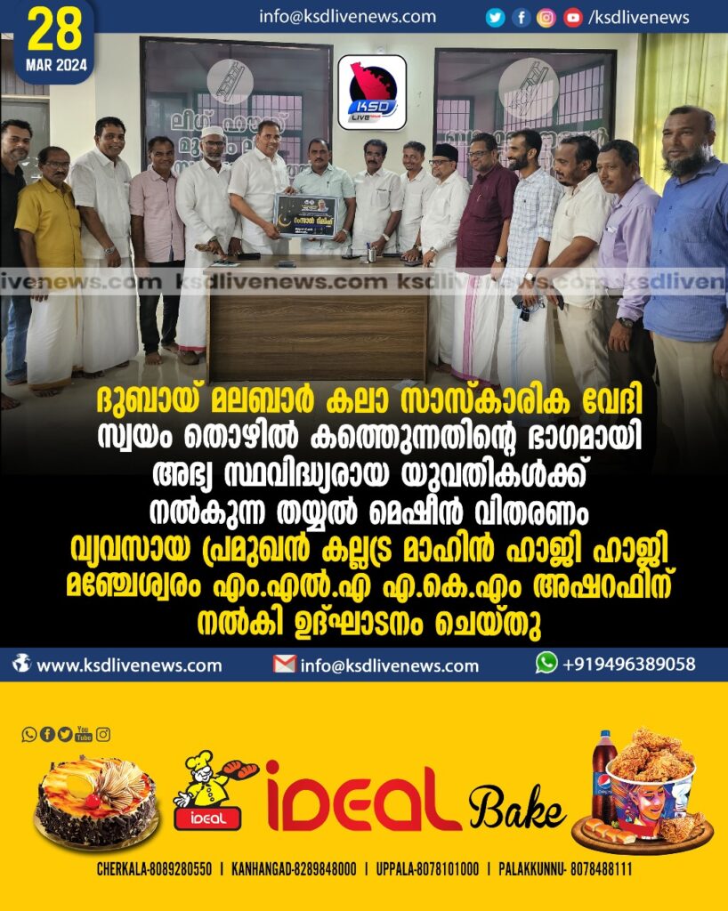 ദുബായ് മലബാർ കലാ സാസ്കാരിക വേദി  സ്വയം തൊഴിൽ കണ്ടെത്തുന്നതിന്റെ ഭാഗമായി അഭ്യ സ്ഥവിദ്ധ്യരായ യുവതികൾക്ക് നൽകുന്ന തയ്യൽ മെഷീൻ വിതരണം വ്യവസായ പ്രമുഖൻ കല്ലട്ര മാഹിൻ ഹാജി ഹാജി മഞ്ചേശ്വരം എംഎൽഎ  എ കെ എം അഷറഫിന് നൽകി ഉദ്ഘാടനം ചെയ്തു.