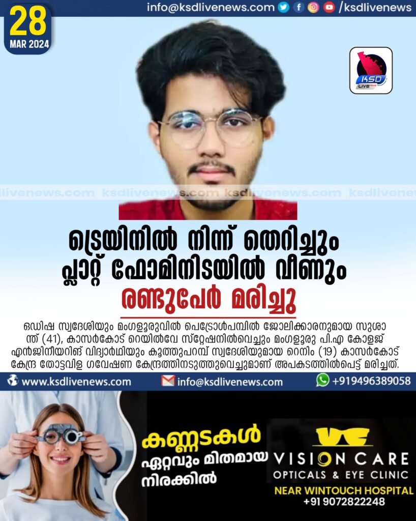 കാസർകോട്: ഓടുന്ന ട്രെയിനില്‍നിന്ന് തെറിച്ചുവീണും അതേ വണ്ടിയുടെയും പ്ലാറ്റ്ഫോമിന്റെയും ഇടയില്‍ പാളത്തിലേക്ക് വീണും വിദ്യാർഥിയും യുവാവും മരിച്ചു. ഒഡിഷ സ്വദേശിയും മംഗളൂരുവില്‍ പെട്രോള്‍പമ്ബില്‍ ജോലിക്കാരനുമായ സുശാന്ത് (41), കാസർകോട് റെയില്‍വേ സ്റ്റേഷനില്‍വെച്ചും മംഗളൂരു പി.എ കോളജ് എൻജിനീയറിങ് വിദ്യാർഥിയും കൂത്തുപറമ്ബ് സ്വദേശിയുമായ റെനിം (19) കാസർകോട് കേന്ദ്ര തോട്ടവിള ഗവേഷണ കേന്ദ്രത്തിനടുത്തുവെച്ചുമാണ് അപകടത്തില്‍പെട്ട് മരിച്ചത്. വ്യാഴാഴ്ച ഉച്ച രണ്ടോടെ മംഗളൂരുവില്‍നിന്ന് ചെന്നൈയിലേക്ക് പോകുന്ന മംഗളൂരു -ചെെന്നെ മെയിലില്‍നിന്നാണ് അപകടം. കാസർകോട് റെയില്‍വേ സ്റ്റേഷനില്‍ ട്രെയിൻ നിർത്തിയപ്പോള്‍ വെള്ളം വാങ്ങാനായി പുറത്തിറങ്ങിയ സുശാന്ത്, ട്രെയിൻ വിട്ടപ്പോള്‍ ഓടിക്കയറുന്നതിനിടെ ട്രെയിനിനും പ്ലാറ്റ് ഫോമിനും ഇടയില്‍പെട്ട് പാളത്തിലേക്ക് വീഴുകയായിരുന്നു. മൃതദേഹം രണ്ട് ഭാഗങ്ങളായി മുറിഞ്ഞു. അപകടത്തെ തുടർന്ന് യാത്രക്കാർ വണ്ടിയുടെ ചങ്ങല വലിച്ച്‌ നിർത്തുകയായിരുന്നു. മൃതദേഹത്തില്‍നിന്ന് ലഭിച്ച തിരിച്ചറിയല്‍ കാർഡാണ് മരിച്ചയാളെ തിരിച്ചറിയാൻ സഹായിച്ചത്. പാളത്തില്‍ കുടുങ്ങിയ മൃതദേഹം പൊലീസെത്തി കാസർകോട് ജനറല്‍ ആശുപത്രി മോർച്ചറിയിലേക്ക് മാറ്റി. ഇതേ ട്രെയിനില്‍നിന്ന് വാതിലിനരികില്‍ നില്‍ക്കുകയായിരുന്ന റെനിം തെറിച്ചുവീണ് കാണാതാകുകയായിരുന്നു. ഷിറിയ പുഴയുടെയും കാസർകോടിന്റെയും ഇടയില്‍നിന്നാണ് വിദ്യാർഥിയെ കാണാതായതെന്ന് കൂടെയുണ്ടായിരുന്ന മറ്റൊരു വിദ്യാർഥി പറഞ്ഞു. സംഭവം അറിഞ്ഞയുടനെ കുമ്ബള ഭാഗത്ത് പ്രദേശവാസികളും പൊലീസും ചേർന്ന് തിരച്ചില്‍ ആരംഭിച്ച്‌ ആറ് മണിക്കൂറിന് ശേഷം പന്നിക്കുന്നിലെ കേന്ദ്ര തോട്ടവിള ഗവേഷണ കേന്ദ്രം അതിഥി മന്ദിരത്തിന്റെ പിറകിലുള്ള റെയില്‍വേ പാളത്തിനരികെയാണ് മൃതദേഹം കണ്ടെത്തിയത്. അപകടത്തെ തുടർന്ന് ട്രെയിൻ അരമണിക്കൂറോളം വൈകി.
