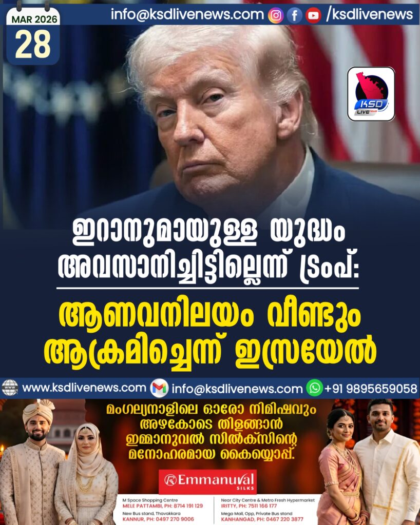 പശ്ചിമേഷ്യൻ യുദ്ധം തുടങ്ങിയിട്ട് ഒരു മാസം. യുദ്ധം അവസാനിച്ചിട്ടില്ലെന്ന് യുഎസ് പ്രസിഡന്റ് ഡോണൾഡ് ട്രംപ്. ഇറാനിലെ 3554 ലക്ഷ്യങ്ങൾ ഇനിയും ആക്രമിക്കപ്പെട്ടിട്ടില്ലെന്നും ട്രംപ്. ഇറാൻ മിസൈൽ ശേഖരത്തിന്റെ മൂന്നിൽ ഒന്ന് തകർത്തെന്ന് അമേരിക്കൻ ഇന്റലിജൻസ്. സംഘർഷത്തിൽ നയതന്ത്ര പരിഹാരം കാണാൻ സാധ്യതകൾ തേടി റഷ്യ. ചെങ്കടൽ വഴി ഇറാനെതിരെ ആക്രമണം നടത്തിയാൽ ശക്തമായി തിരിച്ചടിക്കുമെന്ന് ഹൂതികൾ.
