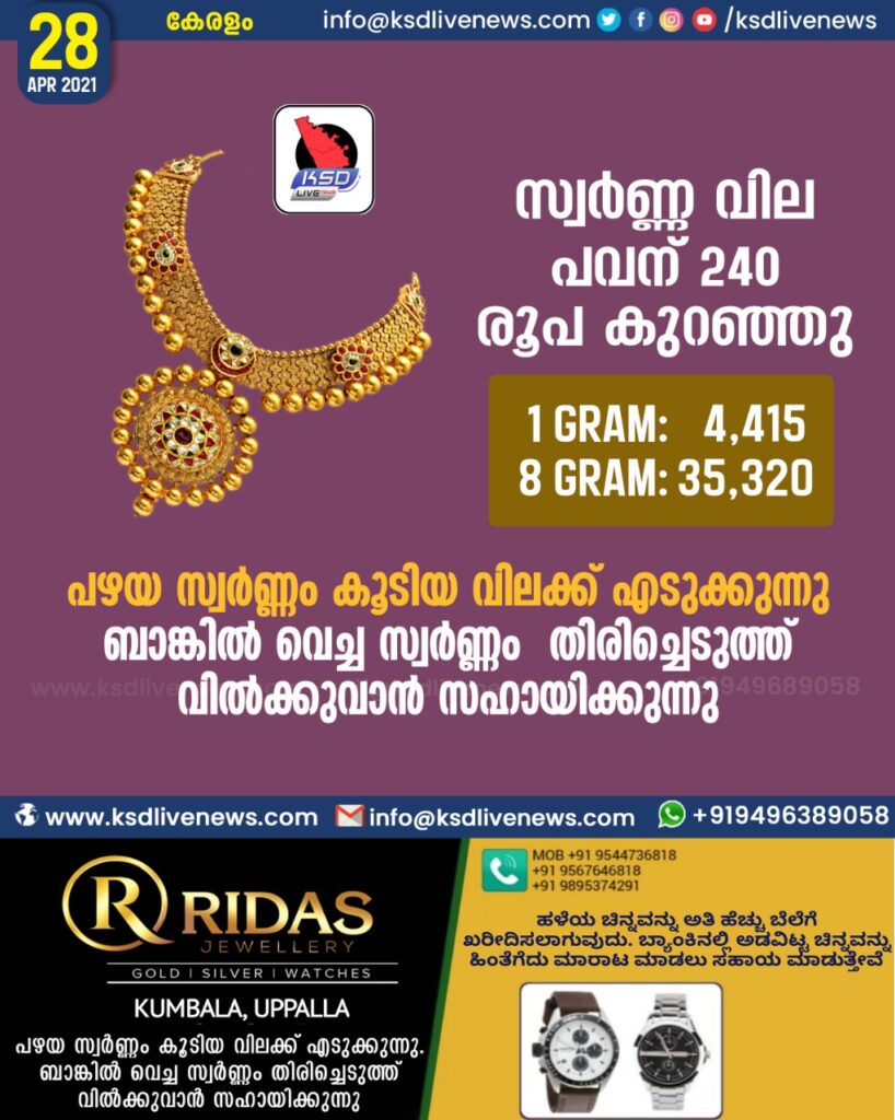 സ്വർണവിലയിൽ വീണ്ടുംഇടിവ്: പവന് 240 രൂപ കുറഞ്ഞ് 35,320 രൂപയായി