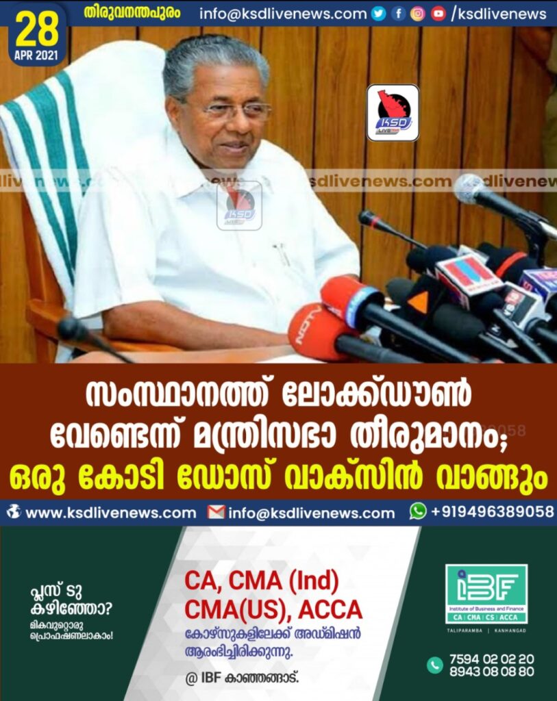 സംസ്ഥാനത്ത് ലോക്ക്ഡൗണ് വേണ്ടെന്ന് മന്ത്രിസഭാ തീരുമാനം; ഒരു കോടി ഡോസ് വാക്സിന് വാങ്ങും