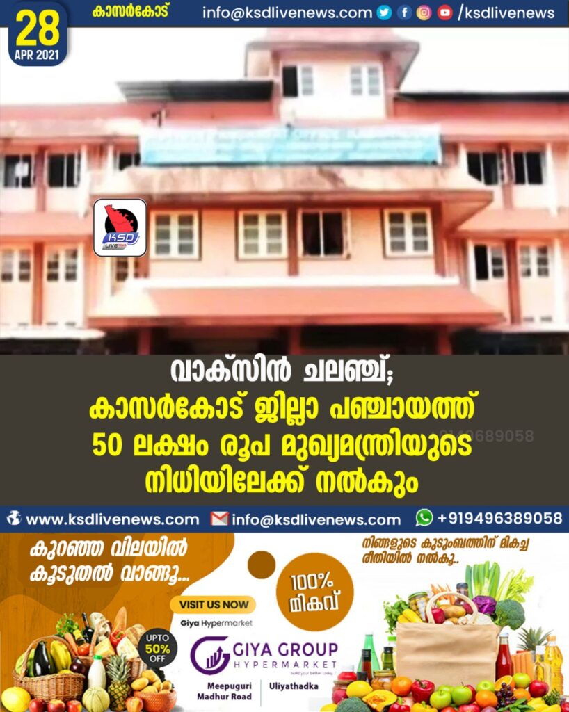 വാക്സിന് ചലഞ്ച്; കാസര്കോട് ജില്ലാ പഞ്ചായത്ത് 50 ലക്ഷം രൂപ മുഖ്യമന്ത്രിയുടെ ദുരിതാശ്വാസ നിധിയിലേക്ക് നല്കും