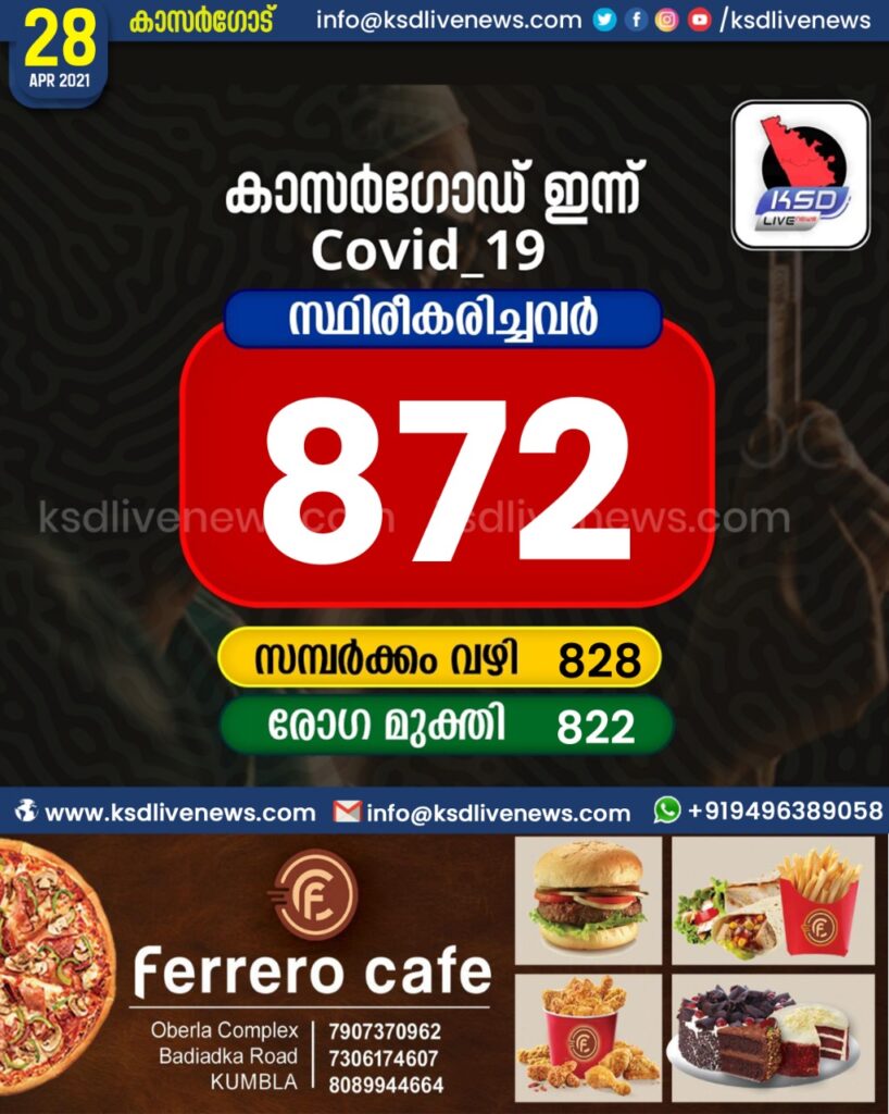 കാസർഗോഡ് ജില്ലയിൽ ഇന്ന് 872 പേർക്ക് കോവിഡ് സ്ഥിരീകരിച്ചു. സമ്പർക്കം വഴി 828 പേർക്കും. 822 പേർക്ക് രോഗമുക്തിSHARE THIS ONകാസർഗോഡ് ജില്ലയിൽ ഇന്ന് 872 പേർക്ക് കോവിഡ് സ്ഥിരീകരിച്ചു. സമ്പർക്കം വഴി 828 പേർക്കും. 822 പേർക്ക് രോഗമുക്തി