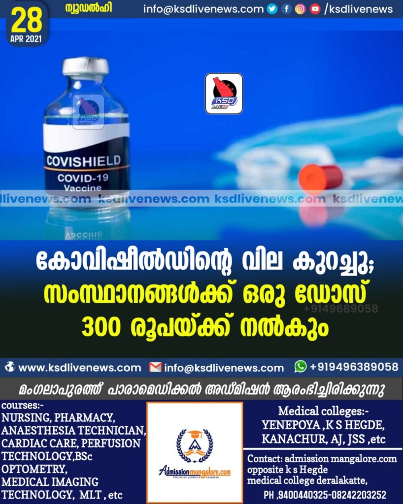 കോവിഷീല്ഡിന്റെ വില കുറച്ചു; സംസ്ഥാനങ്ങള്ക്ക് ഒരു ഡോസ് 300 രൂപയ്ക്ക് നല്കും