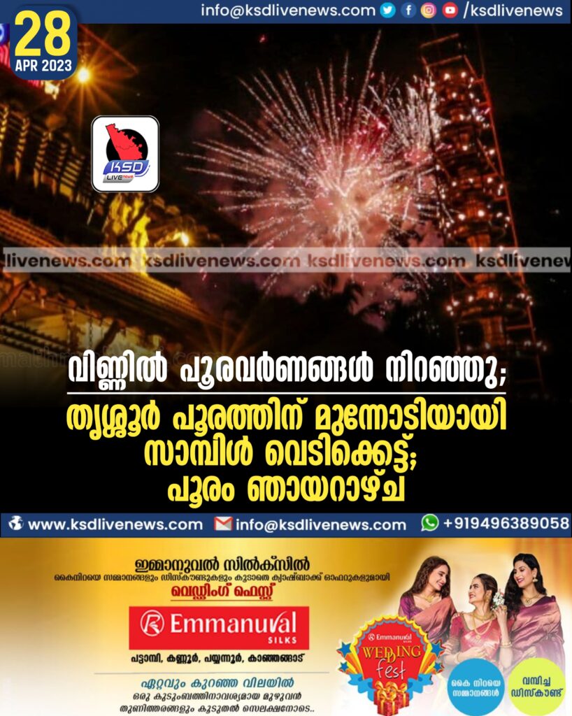 വിണ്ണിൽ പൂരവർണങ്ങൾ നിറഞ്ഞു; തൃശ്ശൂര്പൂരത്തിന് മുന്നോടിയായി സാമ്പിള് വെടിക്കെട്ട്