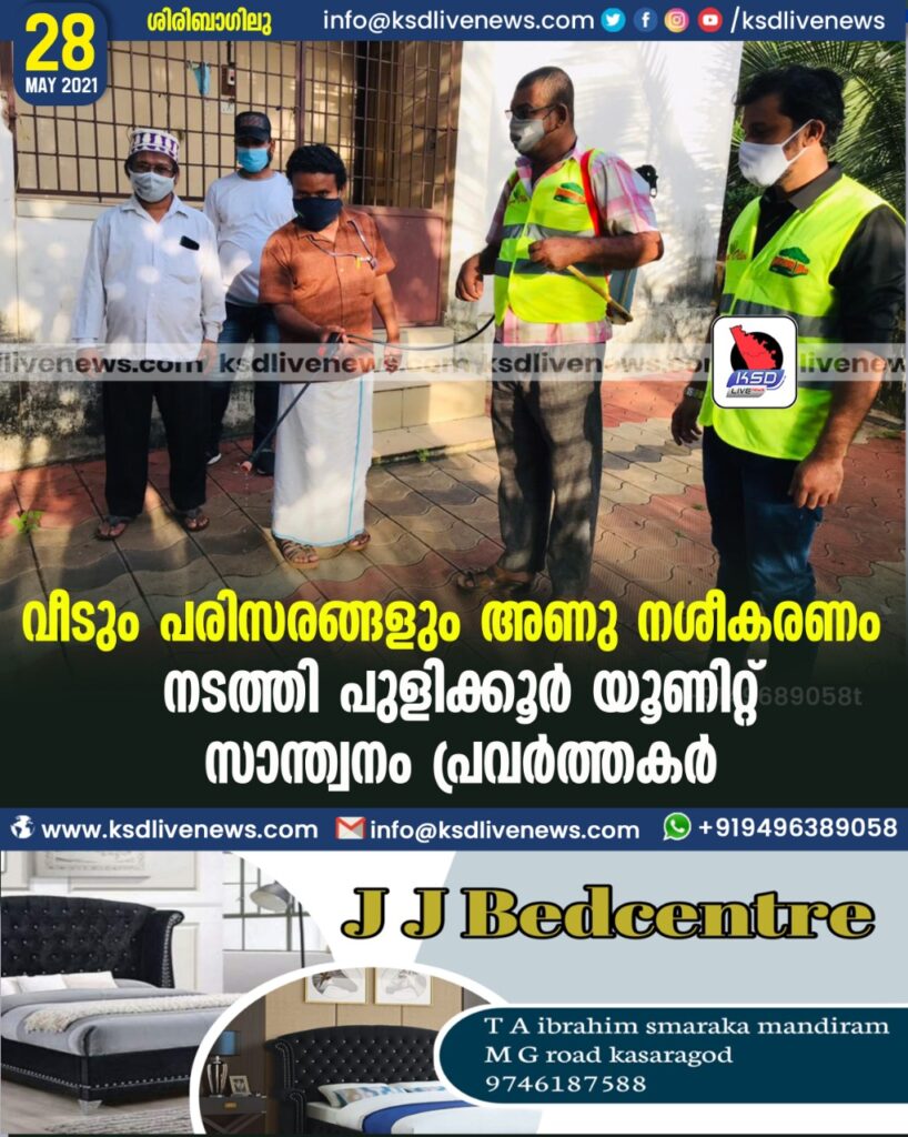 പകർച്ചാ വ്യാധികളും മഴക്കാല രോഗങ്ങളും പടർന്നു പിടിക്കുന്ന സാഹചര്യത്തിൽ മധൂർ പഞ്ചായത്ത് പതിനെട്ടാം വാർഡിലെ വീടുകളും ക്വാട്ടേഴ്സ് പരിസരങ്ങളും അണു നശീക കരണം നടത്തി എസ് വൈ . എസ് പുളിക്കൂർ യൂണിറ്റ് സാന്ത്വനം പ്രവർത്തകർ.