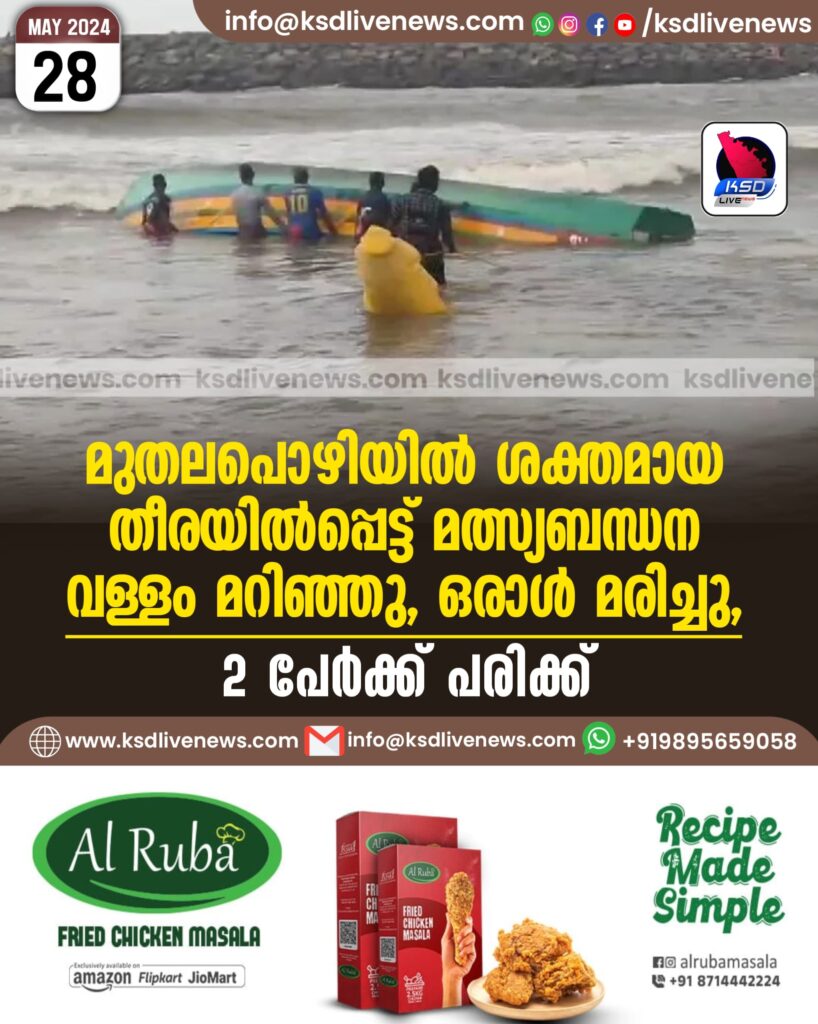 മുതലപൊഴിയിൽ ശക്തമായ തീരയിൽപ്പെട്ട് മത്സ്യബന്ധന വള്ളം മറിഞ്ഞു, ഒരാൾ മരിച്ചു, 2പേർക്ക് പരിക്ക്