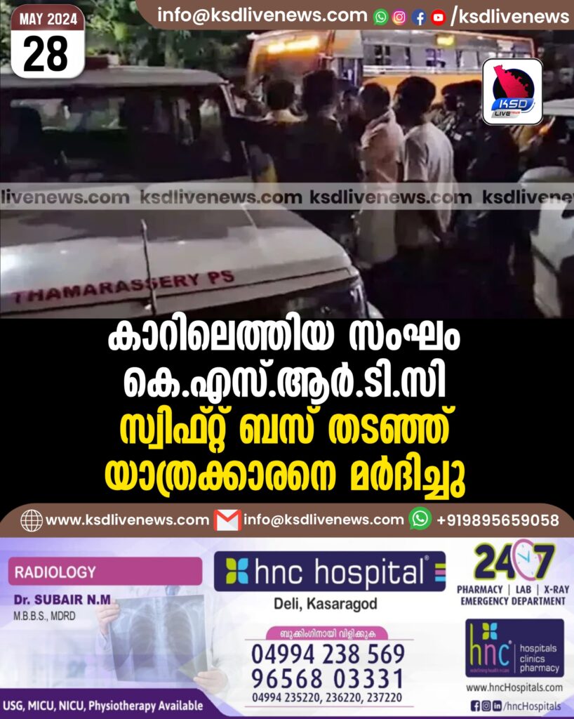 കാറിലെത്തിയ സംഘം കെ.എസ്.ആര്.ടി.സി സ്വിഫ്റ്റ് ബസ് തടഞ്ഞ് യാത്രക്കാരനെ മര്ദിച്ചു