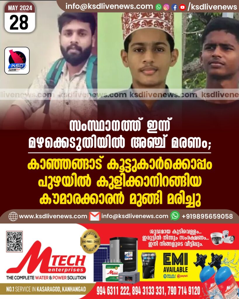 സംസ്ഥാനത്ത് ഇന്ന് മഴക്കെടുതിയിൽ അഞ്ച് മരണം; കാഞ്ഞങ്ങാട് കൂട്ടുകാർക്കൊപ്പം പുഴയിൽ കുളിക്കാനിറങ്ങിയ കൗമാരക്കാരൻ മുങ്ങി മരിച്ചു