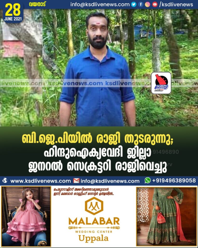 ബി.ജെ.പിയില് രാജി തുടരുന്നു; ഹിന്ദുഐക്യവേദി ജില്ലാ ജനറല് സെക്രട്ടറി രാജിവെച്ചു