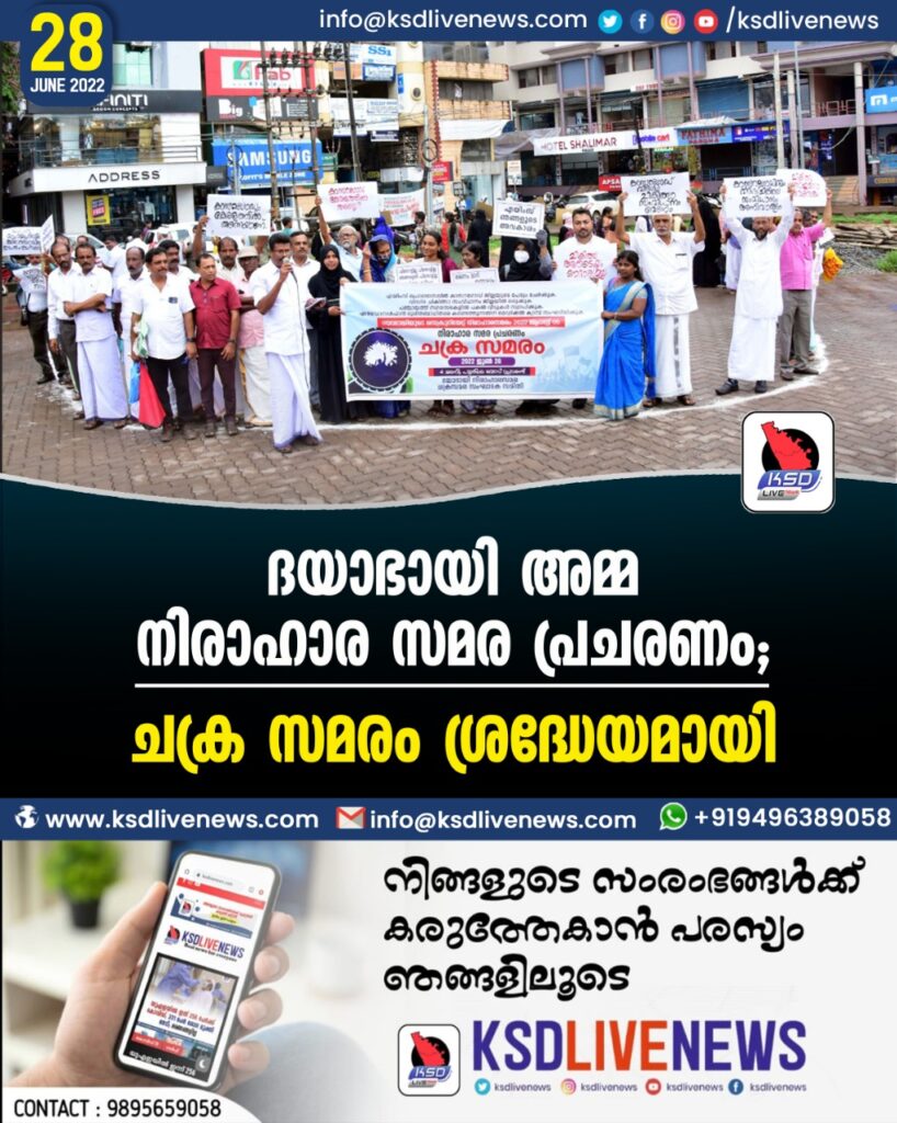 എയിംസ് പ്രൊപോസലില് കാസര്ഗോഡ് ജില്ലയുടെ പേര് ചേര്ക്കുക, വിദഗ്ധ ചികിത്സാ സംവിധാനം ജില്ലയില് ഒരുക്കുക, മുഴുവന് ഗ്രാമപഞ്ചായത്ത് നഗരസഭകളിലും പുനരധിവാസ കേന്ദ്രം- പകല്വീടുകള് സ്ഥാപിക്കുക, എന്ഡോസള്ഫാന് ദുരിതബാധിതരെ കണ്ടെത്തുന്നതിന് വേണ്ടി മെഡിക്കല് ക്യാമ്പ് സംഘടിപ്പിക്കുക തുടങ്ങിയ ആവശ്യങ്ങള് ഉന്നയിച്ചാണ് ദയാഭായി അമ്മ സെക്രട്ടറിയേറ്റ് പടിക്കല് അനിശ്ചിതകാല രാപ്പകല് നിരാഹാരസമരം നടത്തുന്നത്. ചക്ര സമര സംഘാടക സമിതി ചെയര്മാന് ശുക്കൂര് കണാജെയുടെ അധ്യക്ഷതയില് നടന്ന ചക്ര സമരം രാഷ്ട്രീയ കിസാന് മഹാസംഘ് സംസ്ഥാന ചെയര്മാന് അഡ്വക്കേറ്റ് ബിനോയ് തോമസ് ഉദ്ഘാടനം ചെയ്തു. ദയാഭായി അമ്മ നിരാഹാര സംഘാടകസമിതി ചെയര്മാന് അമ്പലത്തറ കുഞ്ഞികൃഷ്ണന് മുഖ്യപ്രഭാഷണം നടത്തി. സംഘാടക സമിതി ജന:കണ്വീനര് കരീം ചൗക്കി സ്വാഗതം പറഞ്ഞു. സുബൈര് പടുപ്പ്, ഫറീന കോട്ടപ്പുറം, അഹ്മദ് ചൗക്കി, സുലൈഖ മാഹിന്, ഷാഫി കല്ലുവളപ്പ്, എന് വി ഗോപിനാഥ് തായന്നൂര്, അബ്ദുള്ള കമ്പിളി, ഉസ്മാന് കടവത്ത്, ഉബൈദുള്ള കടവത്ത്, രാജന് കരിവെള്ളൂര്, കദീജ മൊഗ്രാല്, മുരളി മാനടുക്കം, സീതി ഹാജി, ജംഷി പാലക്കുന്ന്, അഡ്വ. സജി കമ്മത്ത്, ഷിനി ജെയ്സണ്, ഇസ്മായില് കബര്ധാര്, അബ്ദുല് റഹ്മാന് ബന്തിയോട്, ശരീഫ്സാഹിബ്, യശോദ ചട്ടഞ്ചാല്, മുനീര് കോവ്വല്പള്ളി, മുജീബ്റഹ്മാന് കോളിയടുക്കം, സൂര്യനാരായണ ഭട്ട്, മുനീര് മുനമ്പം, ഹക്കീം ബേക്കല്, മിസ്റിയ ചെര്ക്കളം, നെപ്റ്റ്യൂണ് ചൗക്കി, സത്താര് ചൗക്കി, കുഞ്ഞാമു കീഴുര്, ഉസ്മാന് പള്ളിക്കാല്, മിനി. എന് കെ, തസ്രീഫ മൊയ്തീന്, നാസര് മൊഗ്രാല്, സത്താര് കുണ്ടത്തില്, ഷാജി കാടമന, കമറുദ്ദീന് പാടലടുക്ക, നാസര് ബ്ലാര്ക്കോട്, നൗഷാദ് കാട മന, മറിയക്കുഞ്ഞി കൊളവയല് തുടങ്ങിയവര് സംബന്ധിച്ചു. ഹമീദ് ചേരങ്കൈ നന്ദിയും പറഞ്ഞു.