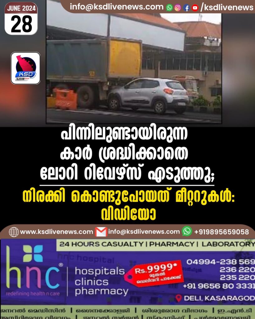 പിന്നിലുണ്ടായിരുന്ന കാർ ശ്രദ്ധിക്കാതെ ലോറി റിവേഴ്സ് എടുത്തു; നിരക്കി കൊണ്ടുപോയത് മീറ്ററുകള്‍– വിഡിയോ