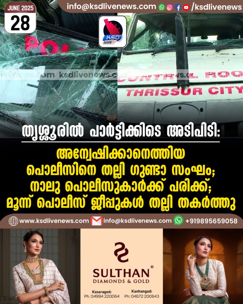 തൃശ്ശൂരിൽ ലഹരി പാര്ട്ടിക്കിടെ അടിപിടി: അന്വേഷിക്കാനെത്തിയ പൊലീസിനെ തല്ലി ഗുണ്ടാ സംഘം; നാലു പൊലീസുകാര്ക്ക് പരിക്ക്; മൂന്ന് പൊലീസ് ജീപ്പുകള് തല്ലി തകര്ത്തു
