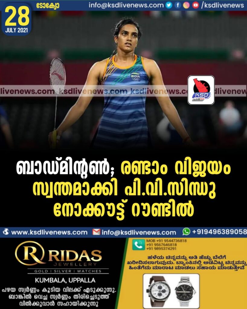 ടോക്യോ: നിലവിലെ വെള്ളി മെഡൽ ജേതാവും ടോക്യോയിൽ ഇന്ത്യയുടെ മെഡൽ പ്രതീക്ഷയുമായ പി.വി.സിന്ധു വനിതാ സിംഗിൾസ് ബാഡ്മിന്റണിന്റെ നോക്കൗട്ട് റൗണ്ടിലേക്ക് പ്രവേശിച്ചു.