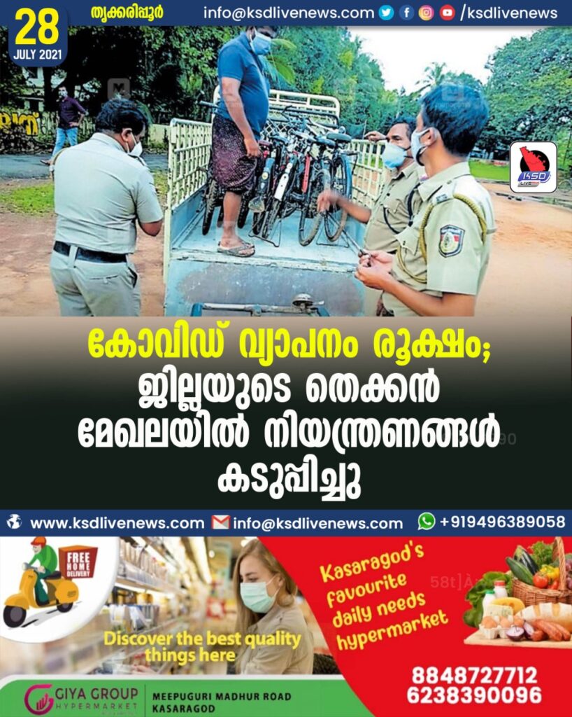തൃക്കരിപ്പൂർ ∙ കോവിഡ് വ്യാപനം ആശങ്കയിലാഴ്ത്തുന്ന സാഹചര്യത്തിൽ ജില്ലയുടെ തെക്കൻ മേഖലയിൽ പൊലിസ് നിയന്ത്രണം കടുപ്പിച്ചു. റോഡുകളിലും കടകളിലും പരിശോധന ശക്തിപ്പെടുത്തിയാണ് പൊലീസ് നിയന്ത്രണം കടുപ്പിച്ചത്. അനാവശ്യ യാത്രകൾ നടത്തുന്നവരെ പരിശോധിച്ച് ആവശ്യമെങ്കിൽ വാഹനങ്ങൾ പിടിച്ചെടുത്തു കേസ് റജിസ്റ്റർ ചെയ്യുന്നുണ്ട്. കോവിഡ് മാനദണ്ഡം പാടെ ലംഘിക്കുന്ന കാഴ്ച പലേടത്തുമുണ്ട്.
