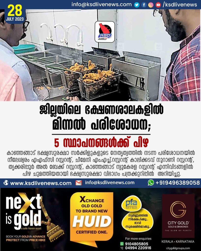 ജില്ലയിലെ ഭക്ഷണശാലകളിൽ മിന്നൽ പരിശോധന; 5 സ്ഥാപനങ്ങൾക്ക് പിഴ