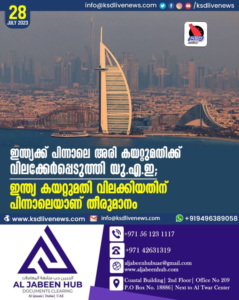 ഇന്ത്യക്ക് പിന്നാലെ അരി കയറ്റുമതിക്ക് വിലക്കേര്‍പ്പെടുത്തി യു.എ.ഇ; ഇന്ത്യ കയറ്റുമതി വിലക്കിയതിന് പിന്നാലെയാണ് തീരുമാനം