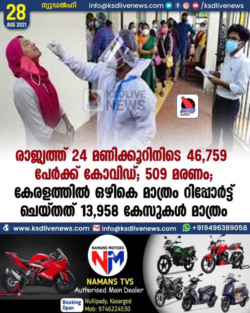 രാജ്യത്ത് 24 മണിക്കൂറിനിടെ 46,759 പേർക്ക് കോവിഡ്; 509 മരണം. കേരളത്തിൽ ഒഴികെ മാത്രം റിപ്പോർട്ട് ചെയ്തത് 13,958 കേസുകൾ മാത്രം