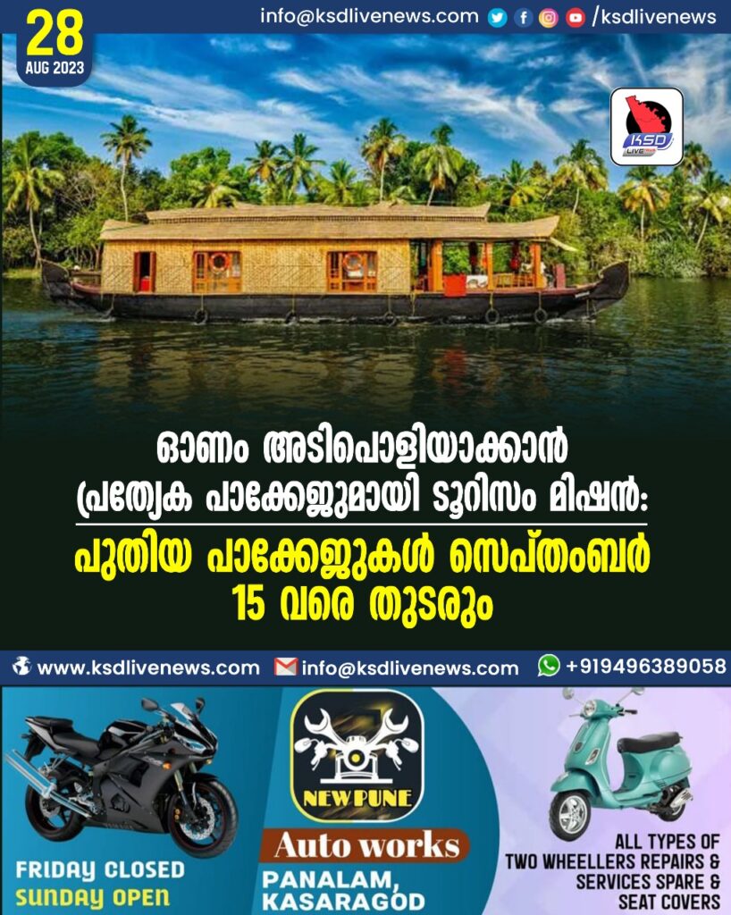 ഓണം അടിപൊളിയാക്കാൻ പ്രത്യേക പാക്കേജുമായി ടൂറിസം മിഷന്: പുതിയ പാക്കേജുകള് സെപ്തംബര് 15 വരെ തുടരും.