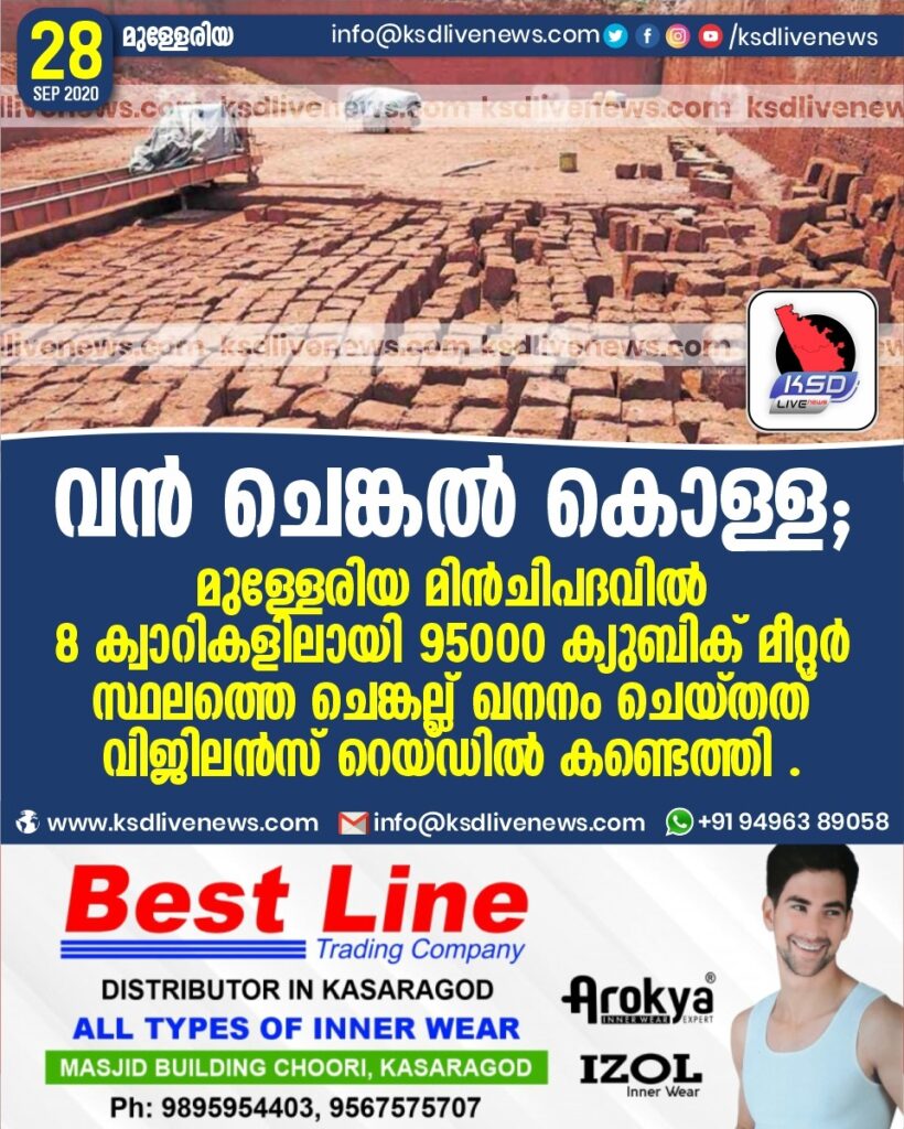 വൻ ചെങ്കൽ കൊള്ള; മുള്ളേരിയ മിൻചിപദവിൽ 8 ക്വാറികളിലായി 95000 ക്യുബിക് മീറ്റർ സ്ഥലത്തെ ചെങ്കല്ല് ഖനനം ചെയ്തത് വിജിലൻസ് റെയ്ഡിൽ കണ്ടെത്തി .