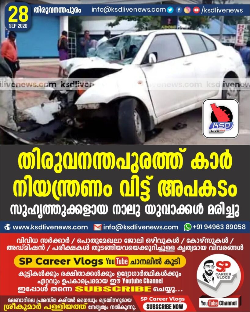 തിരുവനന്തപുരത്ത് കാർ നിയന്ത്രണം വിട്ട് അപകടം ; സുഹൃത്തുക്കളായ നാലു യുവാക്കൾ മരിച്ചു