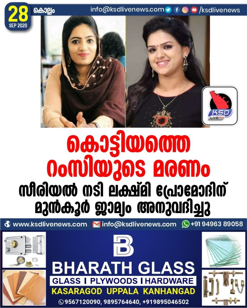 കൊട്ടിയത്തെ റംസിയുടെ മരണം ; സീരിയൽ നടി ലക്ഷ്മി പ്രോമോദിന് മുൻകൂർ ജാമ്യം അനുവദിച്ചു