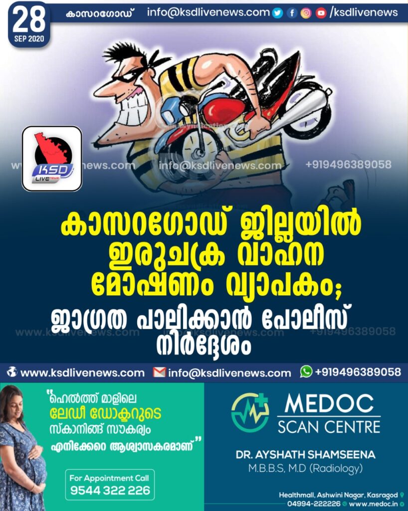കാസറഗോഡ് ജില്ലയിൽ ഇരുചക്ര വാഹന മോഷണം വ്യാപകം ; ജാഗ്രത പാലിക്കാൻ പോലീസ് നിർദ്ദേശം